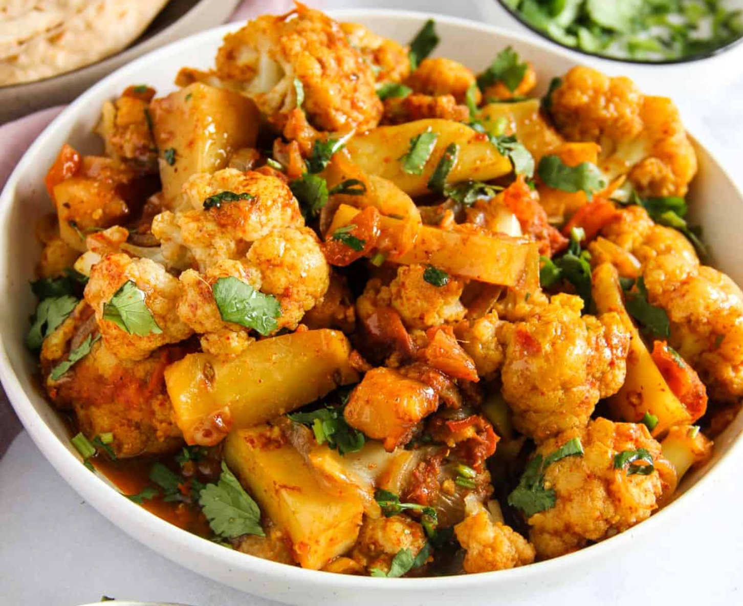 Potato and cauliflower stir-cooked with onion, tomato, and mild spices