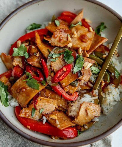 Thai spicy dish combines red and green bell pepper, onion and straw mushroom in pepper sauce