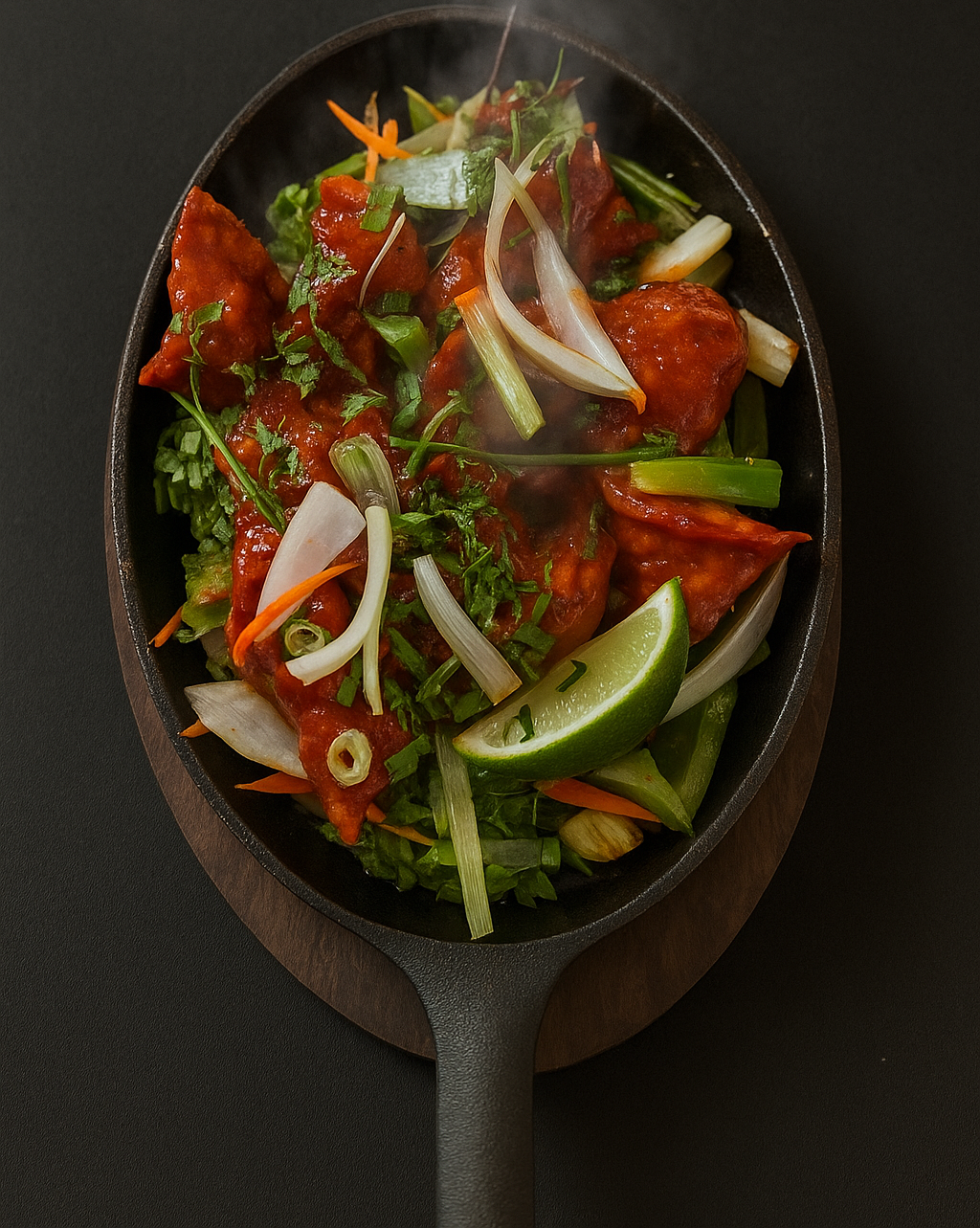 Pan-seared dumplings served on a sizzling hot plate